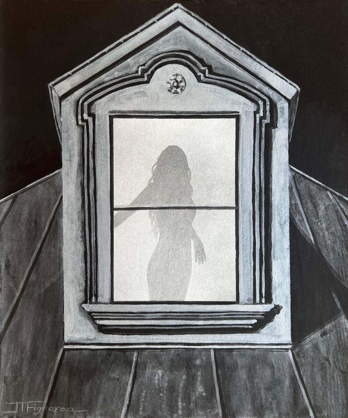 The Secret Window. Silver Paint on Black Paper. 12 x 10 inches.